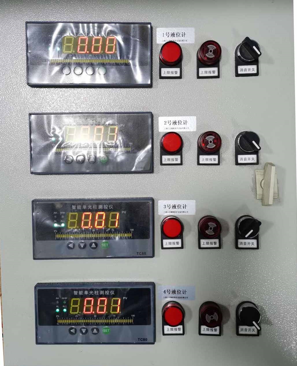 控制柜內(nèi)部嵌入有多個液位變聲器控制主機(jī),該主機(jī)能實(shí)時采集液位變送器的數(shù)據(jù),并更加設(shè)定的報警閾值給出 上下限閾值聲光報警的功能